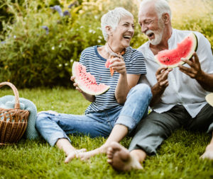 Cheerful mature couple having fun while eating watermelon during picnic day in their backyard.